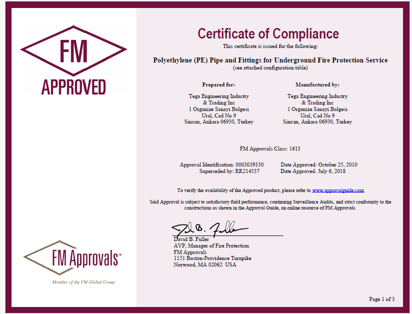 | FM 1613 | Approval Standard for Polyethylene (PE) Pipe and Fittings for Underground Fire Protection | |